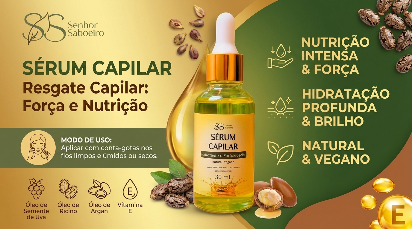 Descubra o poder da natureza com o Sérum Capilar Senhor Saboeiro. Desenvolvido por químicos especialistas, nossa fórmula une a pureza dos óleos vegetais com a eficácia científica para nutrir sem pesar.